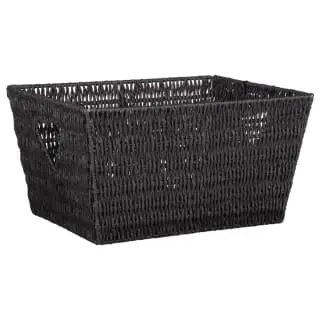 This stylish, black basket, features cut-out heart handle details.